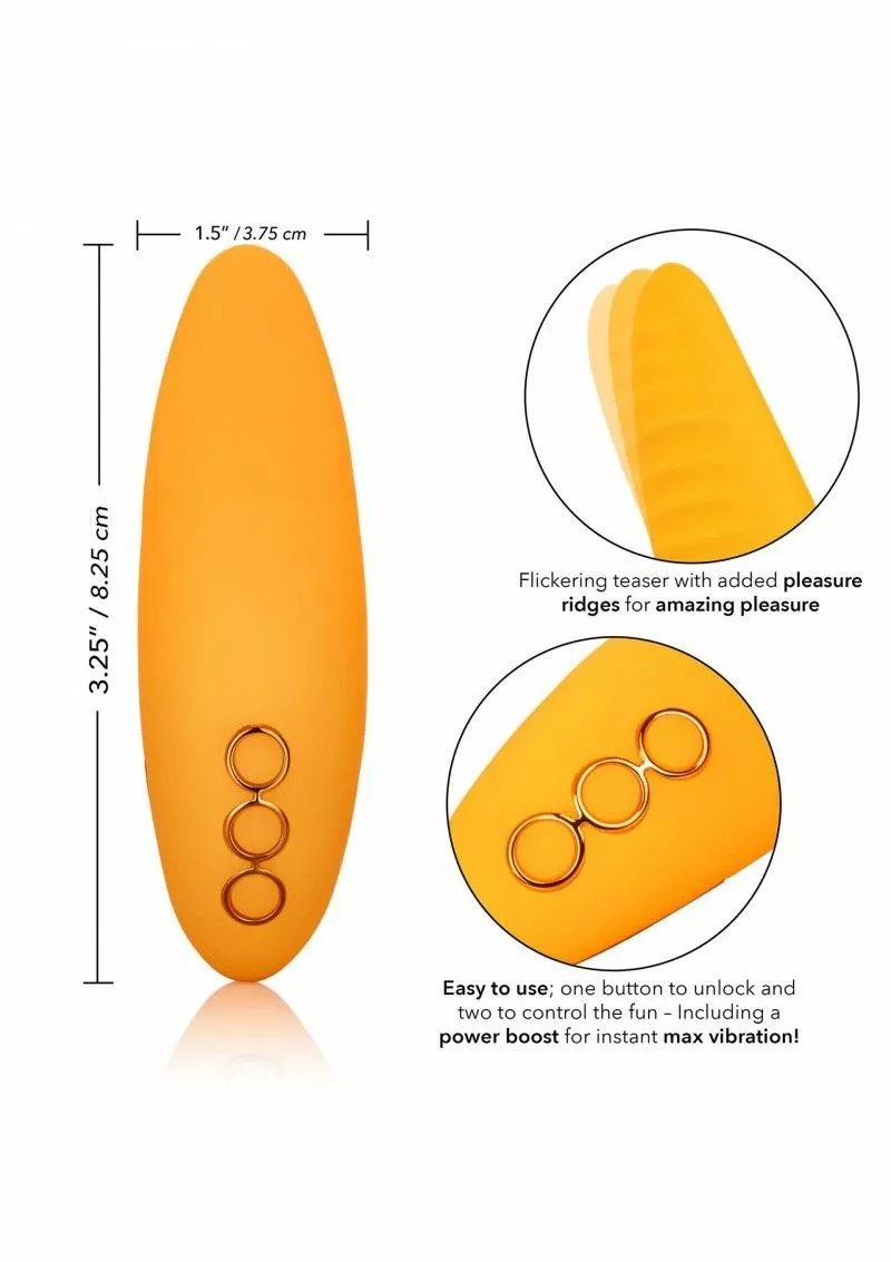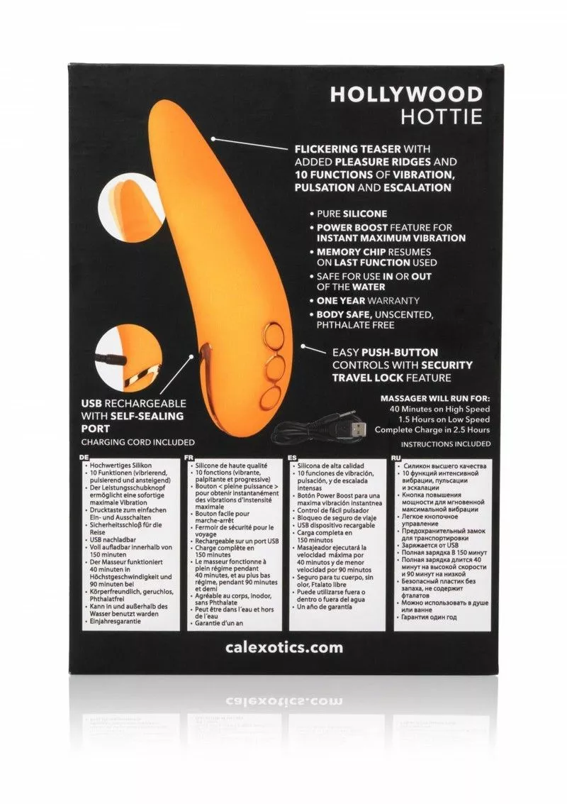 Voel je de ster van de show met deze Hollywood Hottie clitoris stimulator van het merk California Exotic. Deze clitoris stimulator heeft een leuk opvallend kleurtje en beschikt over maar liefst 10 verschillende vibratiefuncties. Alsof dat nog niet genoeg is, is hij ook nog voorzien van power boost functie en flikkerende top. Je zult gestimuleerd en geprikkeld worden als nooit tevoren. Je kunt de verschillende functies makkelijk bedienen met het handige push button systeem. De ergonomische en buigzame vorm kun je leiden naar elk gewenst plekje. Deze Hollywood Hottie heeft een compact formaat en is bedekt met een zijdezachte siliconen laag. Laad hem na gebruik makkelijk op met bijgeleverde USB-kabel en neem deze waterproof clitoris stimulator overal met je mee naartoe!