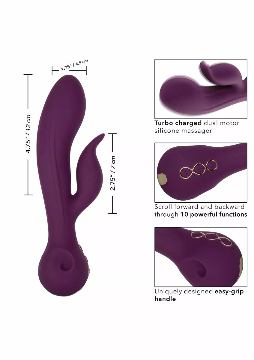 De Rabbit Vibrator Obsession Desire van Obsession is gemaakt met een sensueel gebogen ontwerp met getextureerde teaser en geribbelde schacht. De dubbele vibrator met turbo boost zal zeker bevredigen met de intiem gebogen schacht, flikkerende teaser en 10 krachtige vibratiestanden. Desire is gemaakt van een hygiënisch superieure siliconen. Het materiaal is lichaamsveilig, ongeparfumeerd en ftalaatvrij om je meest gevoelige plekjes blij en gezond te houden. Maak de vibrator na gebruik goed schoon met een toycleaner.