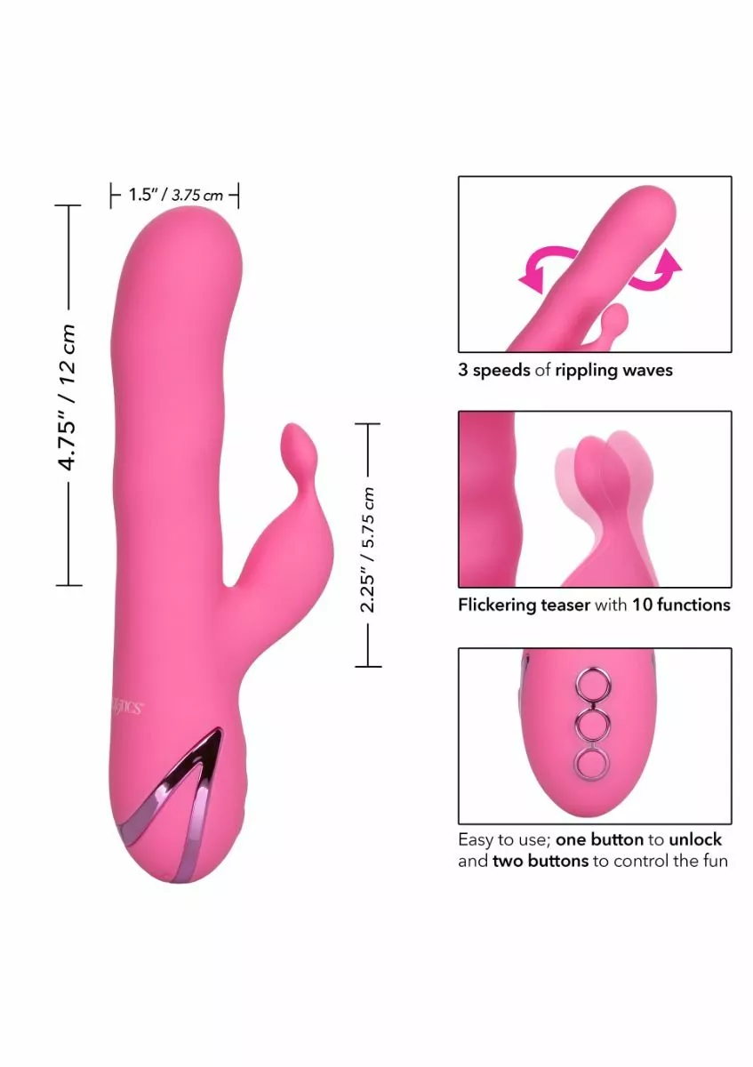 Als je dacht dat de kust van Santa Barbara wat golven had, wacht dan tot je de Vibrator Santa Barbara Surfer ziet. Deze ongelooflijk unieke vibrator verleid jou met heerlijk heen en weer bewegende beads die jou gegarandeerd naar spannende plekken zal brengen. De vibrator is te bedienen met het handige push button systeem aan de onderkant van de toy. Met wel 3 snelheden en 10 verschillende standen heb jij een heel scala aan mogelijkheden. Het materiaal is heerlijk zacht en voelt fijn aan op de huid.