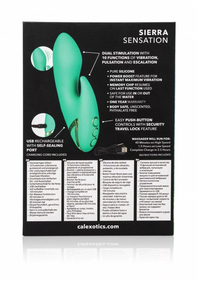 Deze vrolijke groene tarzan rabbit vibrator gaat graag overal met jou mee naartoe om samen spannende avonturen te beleven. De Sierra Sensation vibrator van California Exotic heeft met een lengte van 13 cm en diameter van 3,25 cm een mooi compact formaat en is daarmee een ideaal metgezel op reis. De vorm van de schacht biedt heerlijke inwendige sensaties terwijl de clitorisstimulator jouw clitoris optimaal verwent. Ontdek alle 10 vibratiestanden en geniet van heerlijk hoogtepunten. Sierra Sensation is gemakkelijk te bedienen met het push button systeem en dankzij het zijdezachte materiaal voelt de vibrator heerlijk aan tegen de huid. De vibrator is volledig waterproof, dus je kunt hem niet alleen mee op reis nemen, maar ook mee in bad. Laad hem na gebruik makkelijk weer op met de bijgeleverde kabel.