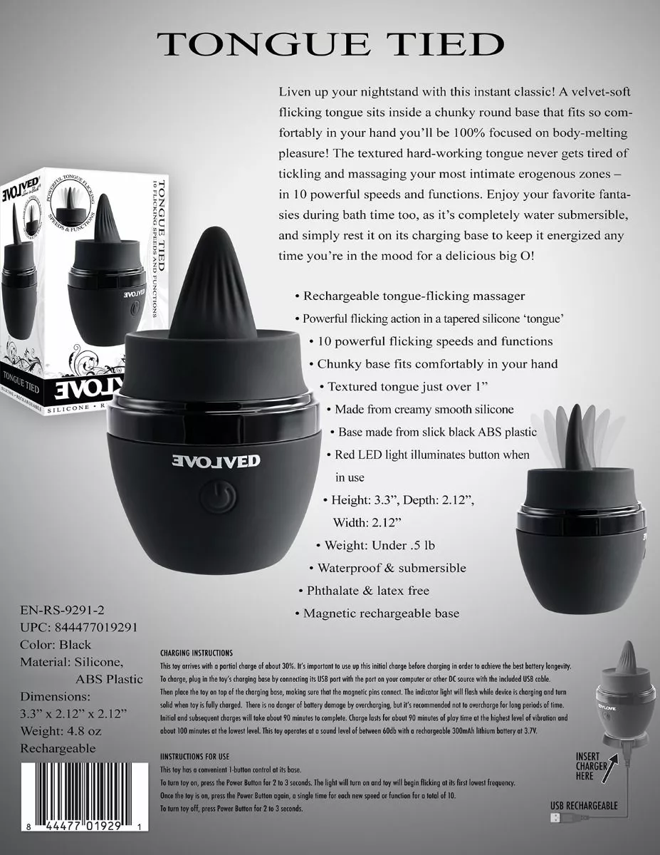 Deze Tong Stimulator Tied van Evolved is een fluweelzachte, bewegende tong die in een stevige ronde basis zit die zo comfortabel in je hand ligt. De getextureerde hardwerkende tong wordt nooit moe van het kietelen en likken van je meest intieme plekjes in 10 sterke snelheden en standen. Wanneer de tong stimulator leeg is laad je hem eenvoudig op met de meegeleverde magnetische oplaadkabel.