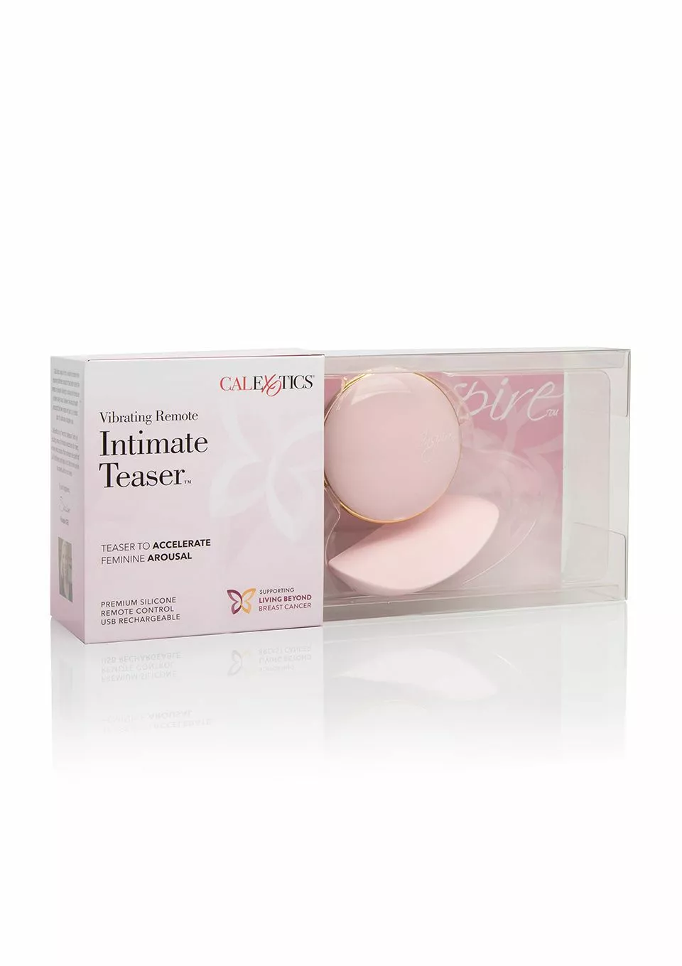 De Inspire Teaser uit de Inspire Collection van het merk CalExotics is gemaakt voor vrouwen die verlangen naar ultieme stimulatie. De sextoy is glad en zacht door het siliconen materiaal en bovendien waterproof. De Teaser is een unieke clitorus massager met een ergonomisch design dat speciaal ontworpen is voor vrouwelijke opwinding en het zorgt voor betere doorbloeding van de intieme zone. Het apparaat is naar het lichaam gevormd en kan dus gemakkelijk in de slip gedragen worden. De Teaser heeft 10 vibratie en pulsatie standen, plus 5 snelheden per functie. Deze clitorus vibrator is te bedienen met een afstandsbediening met een zeer discreet uiterlijk, het uiterlijk van een compact poeder doosje. Verder is deze virbrator oplaadbaar met een USB-kabel.