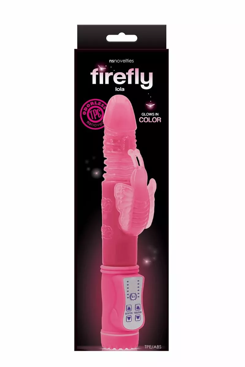 De Butterfly Vibrator Firefly Lola van NS Novelties is gemaakt met lichaamsveilig TPE en te gebruiken met alle soorten glijmiddelen. Met een stootfunctie in de schacht gloeit dit leuke en robuuste Lola vibrator in levendige kleuren en zorgt het voor klimatologische sensaties van binnen en van buiten! De glow-in-the-dark rabbit vibrator heeft 6 vibratiestanden en 6 stuwstanden. Lola werkt op 4 x AAA batterijen, die worden er niet bijgeleverd.