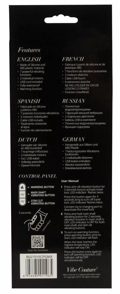De Rabbit Vibrator Vibe Couture is een echte topper in zijn soort. De clitoris stimulator zorgt voor een intens en heftig orgasme en de vibrator zelf weet moeiteloos je G-spot te vinden. Wat deze vibrator bijzonder maakt is dat er een verwarm functie beschikbaar is. Hierdoor voelt de vibrator aan als de penis van een man. Maak een keuze uit de 7 verschillende vibratiestanden en geniet. Je kunt je sextoy gemakkelijk opladen met behulp van de meegeleverde usb kabel zodat hij op ieder gewenst moment beschikbaar is. Deze rabbit is waterproof en kan dus ook mee in bad of onder de douche.