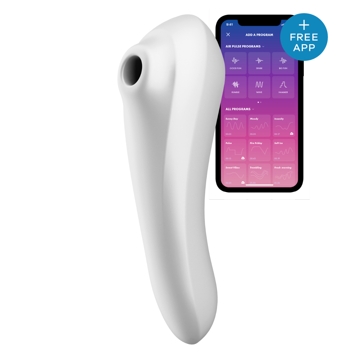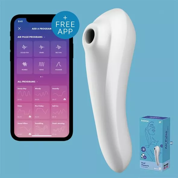 De Satisfyer Dual Pleasure Air Pulse vibrator is een veelzijdig speeltje dat op meerdere manieren gebruikt kan worden. Geniet van gerichte clitoris stimulatie door middel van Satisfyer’s bekende luchtdruk pulsaties of beleef diepe interne vibraties met de G-spot vibrator. De Dual Pleasure Air Pulse Vibrator is gemaakt van zacht siliconen en heeft een inbrengbaar gedeelte van 11 cm. De pulserende luchtdruk standen en verschillende vibraties zijn onafhankelijk van elkaar bestuurbaar en te bedienen op de Dual Pleasure zelf of middels de gratis Satisfyer app. Verbind de Satisfyer via bluetooth en creëer zelf spannende ritmes of laat de trillingen aansturen door iemand anders. De Dual Pleasure is volledig waterproof en oplaadbaar.
