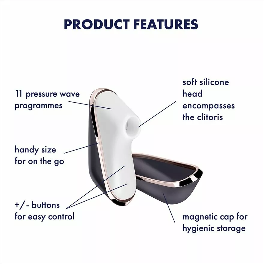 De Satisfyer Pro Traveler zal jou verwennen met wel 11 verschillende standjes en is uiterst stil te noemen. Dus waar jij ook bent, hij zal zich niet laten horen zodat jij hem echt overal kan gebruiken. Hij is te bedienen met het handige pushbutton systeem aan de onderkant van de toy met het plusje en de min verander jij de intensiteit van de luchtdruk pulsaties. De luchtdrukpulsaties zullen lekker op jouw clitje tikken voor een overweldigend gevoel en zullen jou binnen no time tot een overheerlijk orgasme brengen.